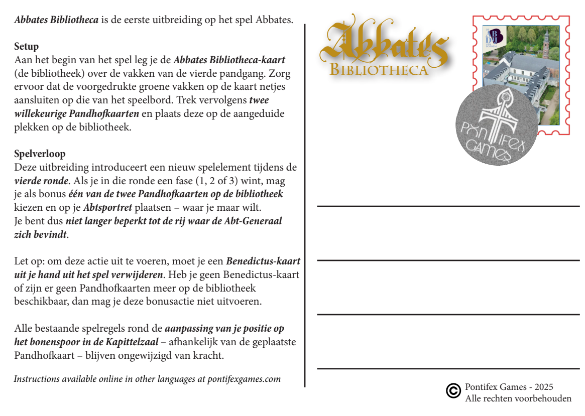 De uitbreiding komt in de vorm van een stijlvolle postkaart – perfect om te spelen én om op te sturen naar vrienden die ook van bordspellen houden. Een leuke verrassing in de brievenbus voor elke Abbates-liefhebber!